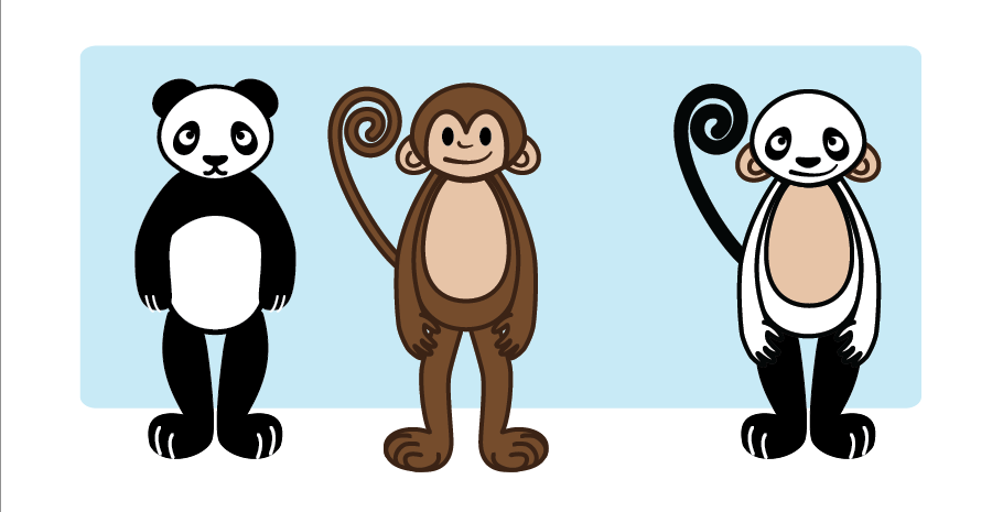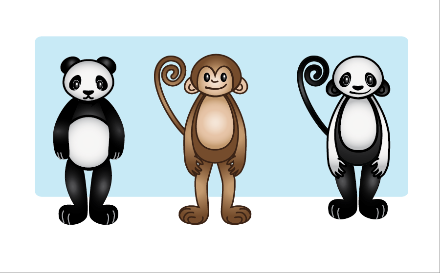 Finished up the shading/gradients. Added a shine to the eyes, made the lines beween fingers/toes lees thick. Changed the Panda and Panda offspring eyes, and changed the coloring on the Monkey/Panda or Moanda to make it a bit less ugly. Marc had said it was the ugliest thing he’s ever seen, so Moanda got a makeover.